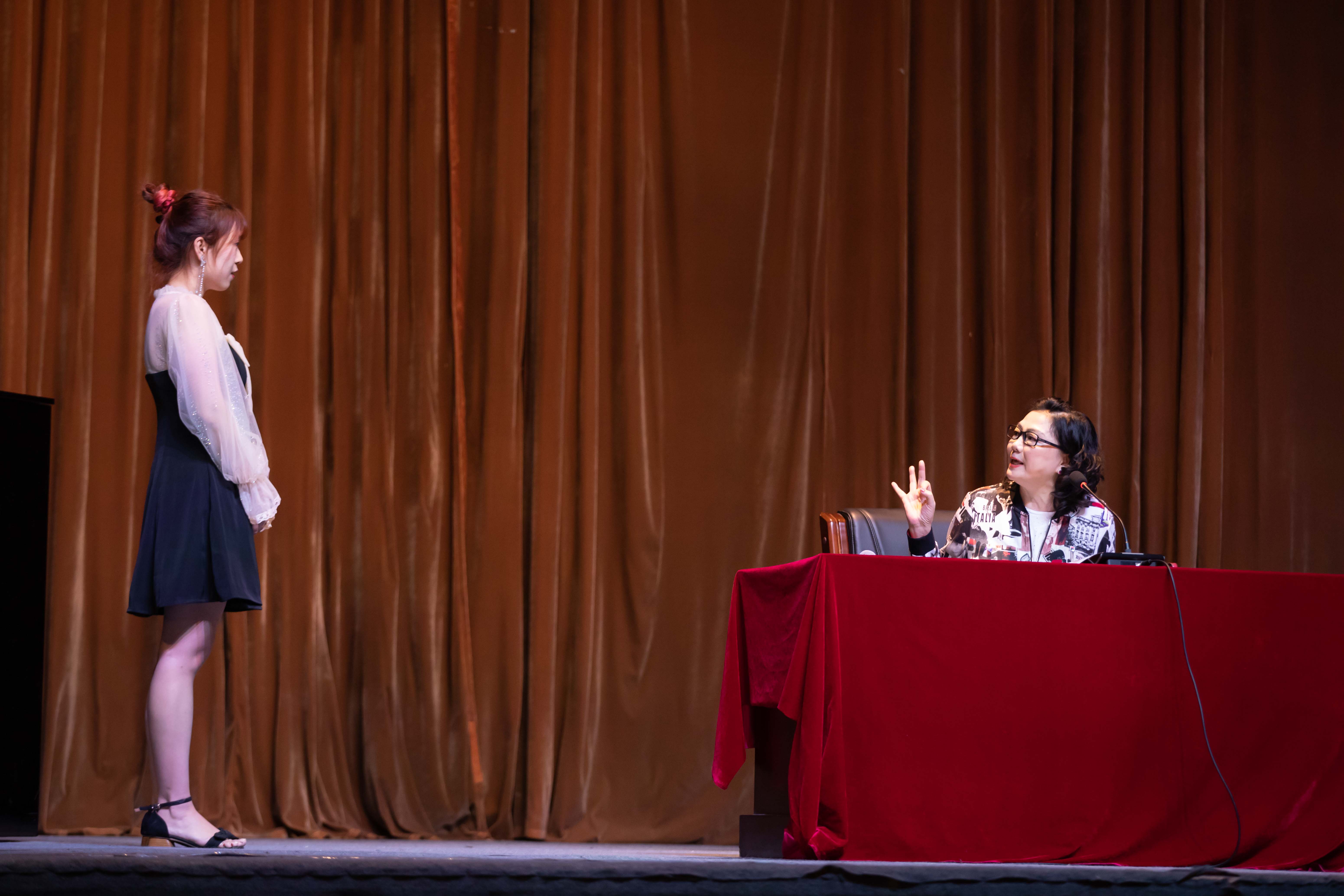 接下来第二位同学邹泓睿演唱了《祖国,慈祥的母亲》,马秋华教授指出,该生歌唱的情感较为投入、乐感较好,声音规范、自然,但喉咙打开的还不够,需加强基础训练,并且强调学生上台要注意自己的舞台形象和精神面貌,给观众以“好听、好看”的视听盛宴。