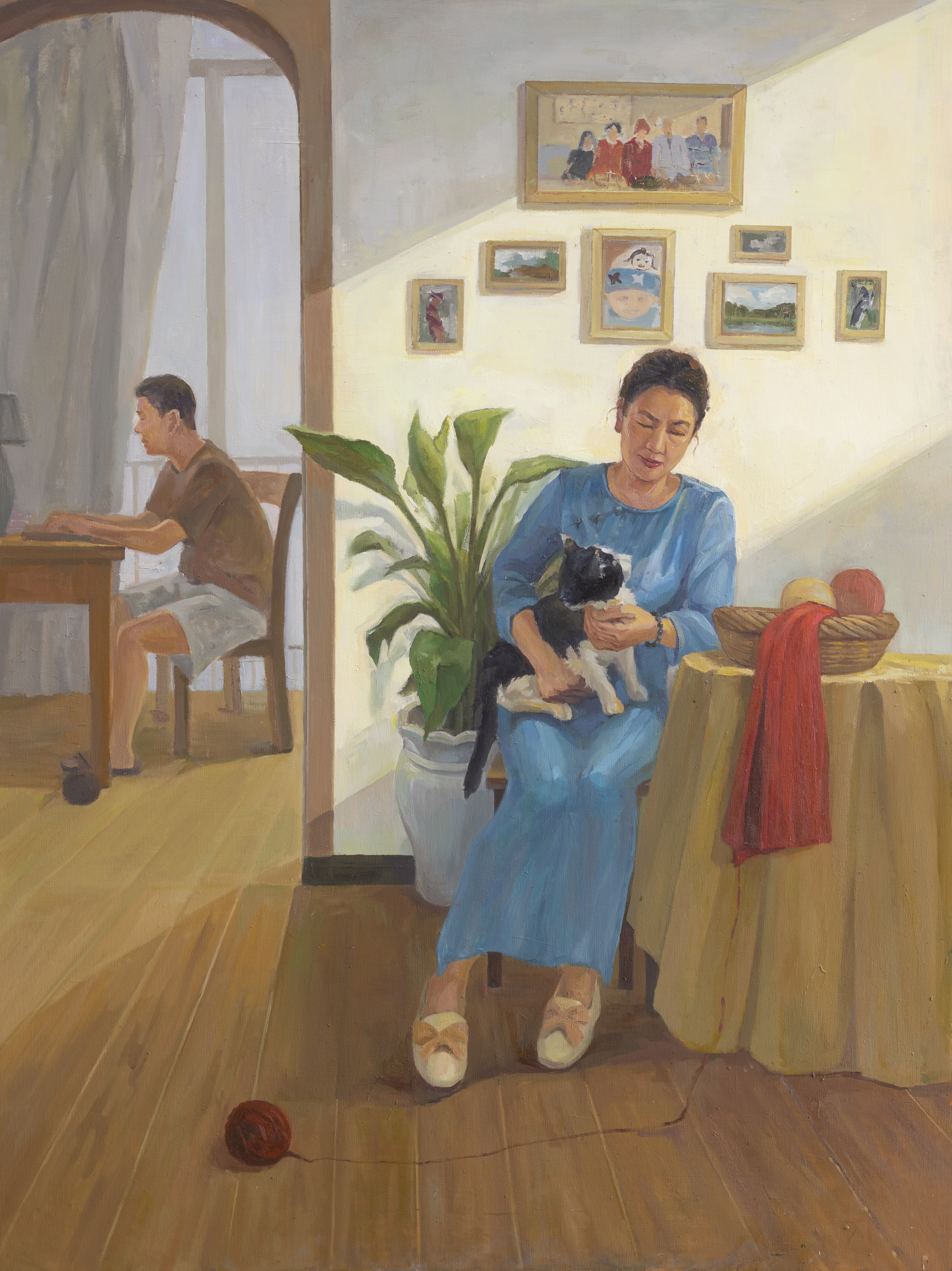 我的作品创作背景主要是在一个清晨我的母亲正抱着猫,与它嬉闹的一个瞬间场景为主体,清晨的阳光透过窗户笼罩在她们身上,旁边放着为我父亲织的围脖,地上滚落的毛线球,远处正在工作的父亲,这个画面让我觉得美好与惬意,因此我将这幅作品起名起为《岁月静好》,它不仅是画中我想要表达的主题思想,更是我心中最温暖,最想要表达的情感。