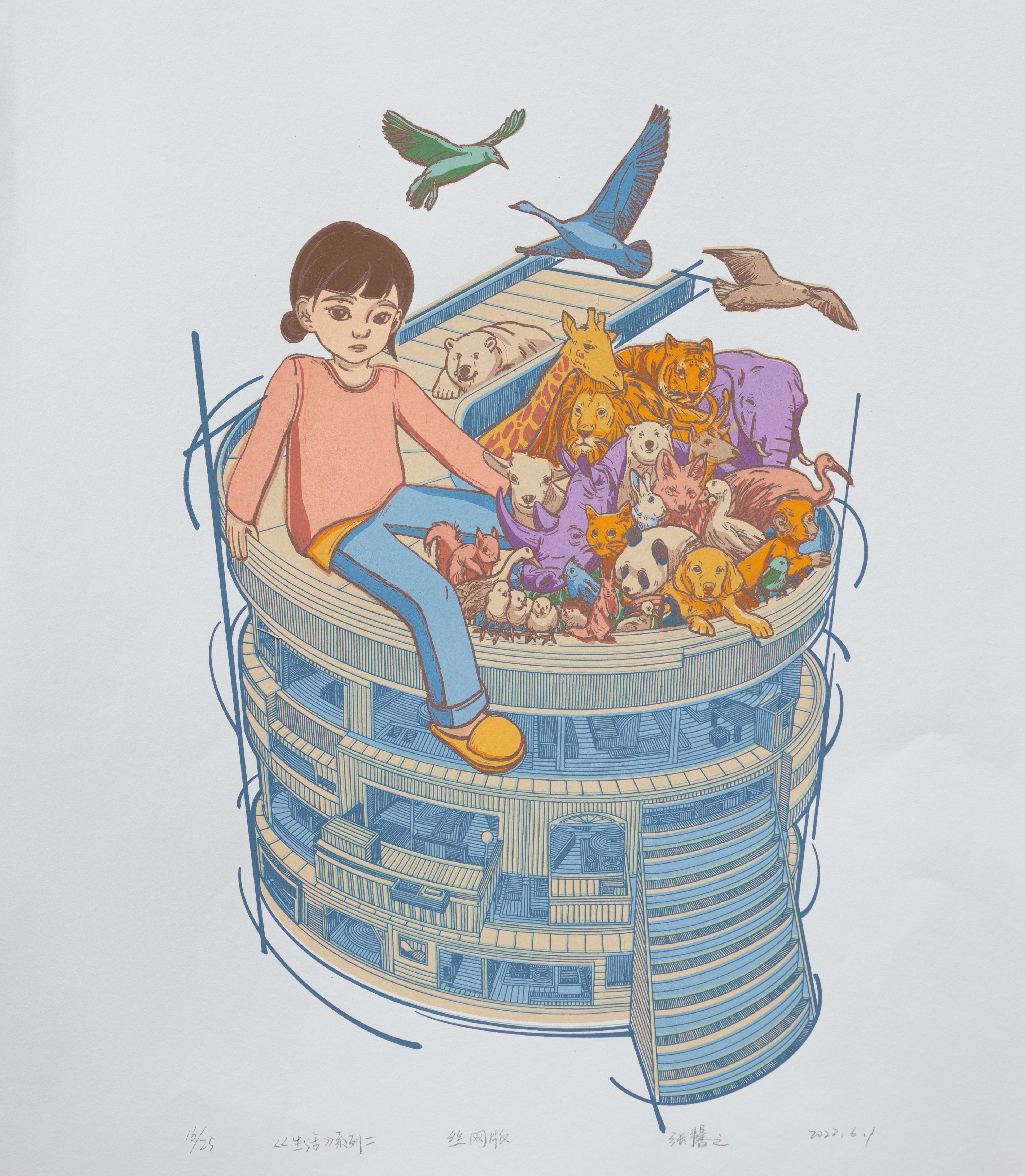 两幅成系列的创作中,城市建筑结构最为框架,各自以一个孩子作为索引,加入各种生物符号作为载体,构图中把生物与社会紧密结合,突显出生物多样性的重要,表现出创作画面的元素碰撞和各种符号之间的和谐。
