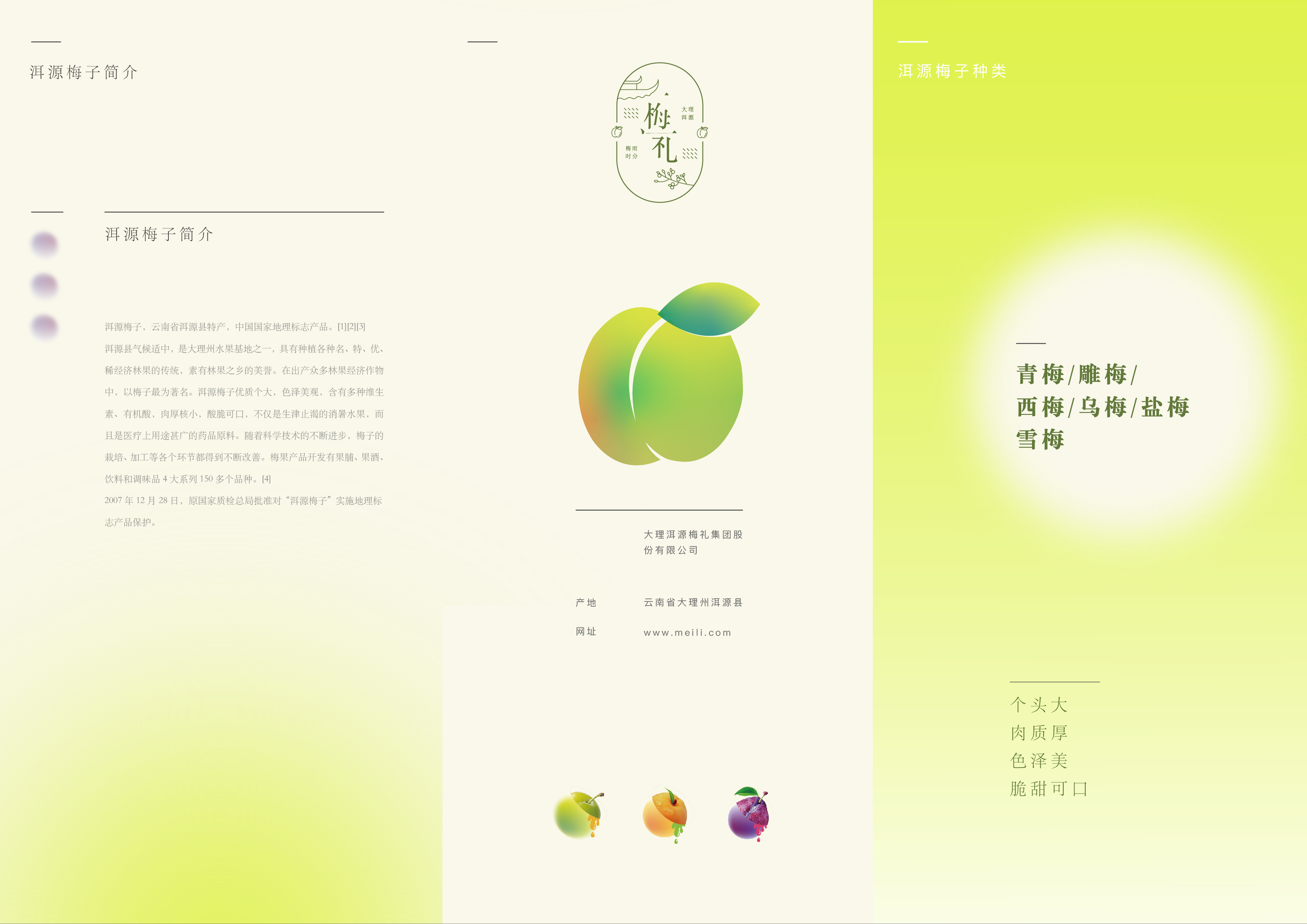 毕业设计以“梅·礼”二字为题,从视觉、功能、地域文化、生态等角度对青梅产品的品牌及包装设计进行了一系列的探析。针对大理的梅子系列产品进行包装设计,种类包括果脯、青梅果肉、梅子甜点、生梅糖、酸梅汁、青梅绿茶、梅子酒、梅子酱八类产品包装。题中采用的“礼”同“理”,也可理解为“礼物”。