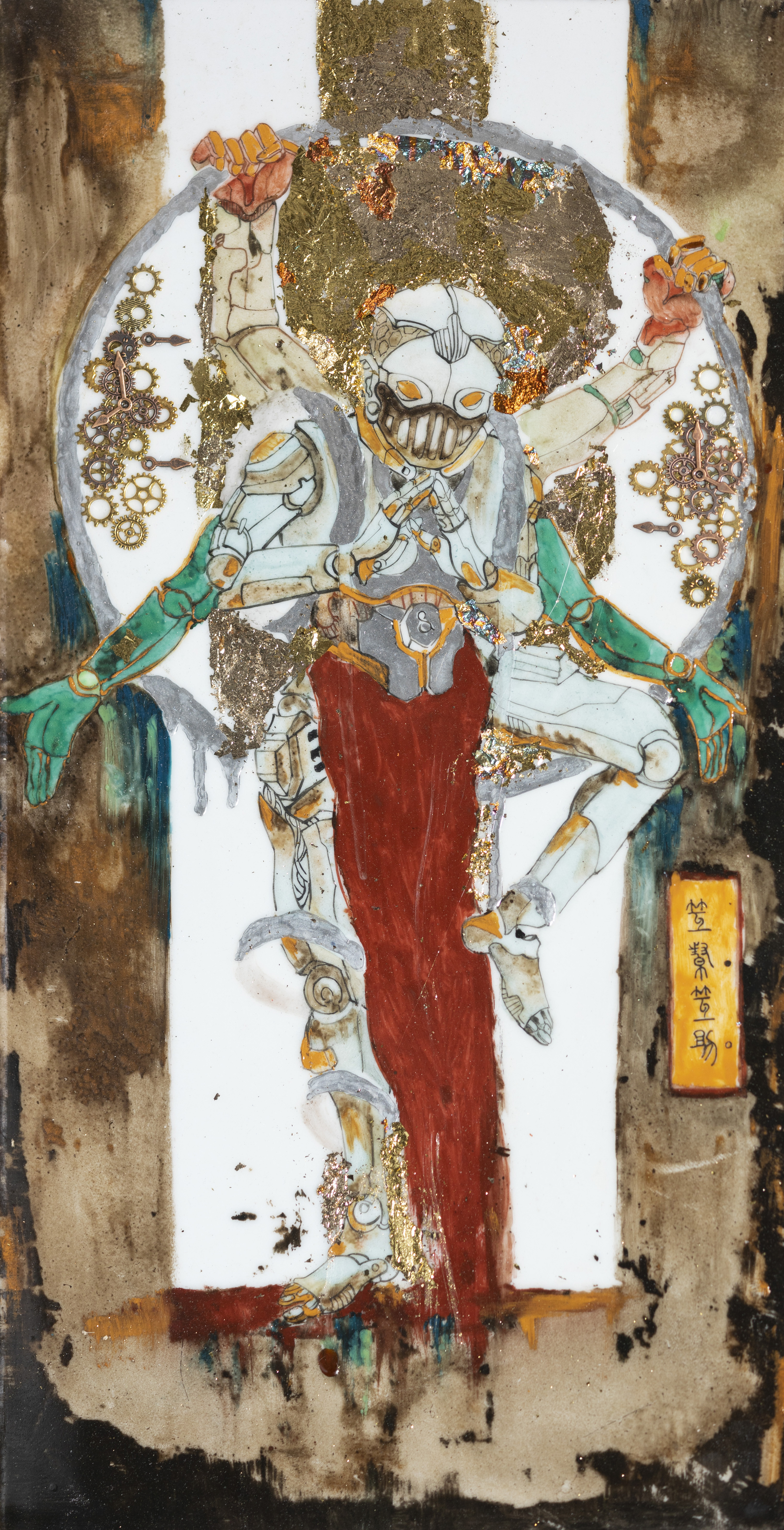 灵感来源于初中时期看到的电影《太极》系列,电影中先进的金属机械和与世隔绝的小村子形成了鲜明的反差,传统的思想观念与科技发展相碰撞,给予我一种很特别的感觉,于是我也想尝试运用这种反差绘制毕业创作。运用金这个金属本身自带的属性,通过绘制机械的生锈的效果,与金色形成对比,也借用机械被腐蚀的形象来表现我自身长久以来的坏毛病,希望自己能够在此之后摆脱这些问题。